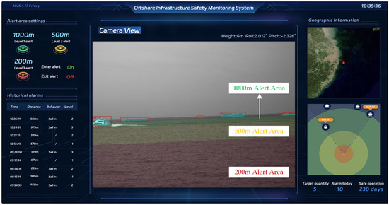 - Detected vessel targets: the positions (calculated from Equations (5)–(9)) of vessels detected within the camera’s range, updated in real time to show their movements and proximity to the infrastructure. In addition, the distance information can be displayed near each target.