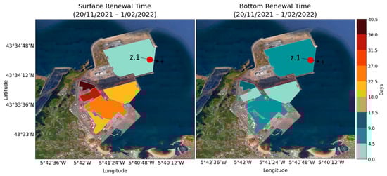 Spatial Variability Analysis of Renewal Time in Harbour Environments Using a Lagrangian Model