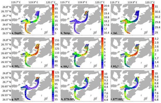 (a) Station depth (m) and average sea surface (b) temperature (°C), (c) salinity, (d) NO3− concentration (μmol dm−3), (e) NH4+ concentration (μmol dm−3), (f) PO43− concentration (μmol dm−3), (g) NO3−/PO43− ratio, (h) δ15N-NO3− value (‰), and (i) δ18O-NO3− value (‰) in Sansha Bay during spring 2024.
