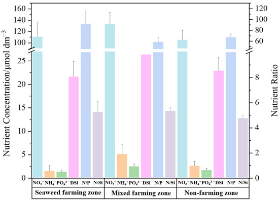 A one-way ANOVA analysis was undertaken for data from the seaweed farming, mixed farming, and non-farming zones using SPSS software v. 26. The results indicate significant differences in nutrient concentrations and nutrient ratios between the three zones (p < 0.005; Table S3), suggesting differences in nutrient sources and cycling and validating the rationale for the zonation. The mixed farming zone had the highest nutrient levels, with average NO3−, NH4+, and PO43− concentrations of 133.2, 5.09, and 2.45 μmol dm−3, respectively (Figure 3). Millions of tons of feed are applied annually to support fish farming in Sansha Bay [67], with 5–10% decomposing in the water [68], thereby releasing large amounts of nitrogen. Previous studies have shown that farming L. crocea and shellfish results in substantial increases in inorganic nitrogen concentrations in marine environments [69]. Aquaculture activities, particularly the feeding of L. crocea, are thus likely the primary contributors to elevated nutrient concentrations in the mixed farming zone. Conversely, the seaweed culture zone had the lowest nutrient concentrations, with average NO3−, NH4+, and PO43− concentrations of 110.7, 1.46, and 1.30 μmol dm−3, respectively, significantly lower than those of the mixed farming and non-farming zones. This may be attributed to substantial nutrient uptake during algal growth [70].
