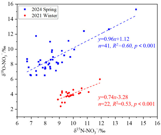 Relationship between δ15N-NO3− and δ18O-NO3− (‰) in surface water in Sansha Bay during spring 2024 and winter 2021.