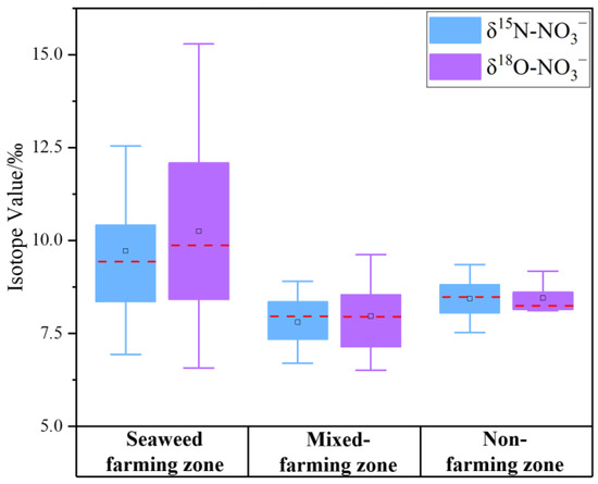 δ15N-NO3− and δ18O-NO3− values across the three aquaculture zones (seaweed farming, mixed farming, and non-farming) during spring 2024. The red dashed line represents the median line.