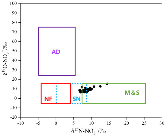 Relationship between δ15N-NO3− and δ18O-NO3− values in Sansha Bay (black dots) during spring 2024. End-member values for potential NO3− sources are from Kendall et al., 2007 [85] and Zhang et al., 2018 [60]. SN = soil organic N; M&S = manure and sewage; NF = nitrogen fertilizer; AD = atmospheric deposition.
