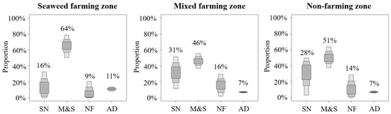 Based on survey observational data and a 2022 aquaculture map for Sansha Bay [55], we categorized the study area into three zones: seaweed farming, mixed farming (shellfish and fish), and non-farming. Seaweed farming occurs mainly in the northeastern inner bay, with only a minor presence in the estuary; mixed farming occurs in the central part of the main channel and inner bay; and the non-farming zone is located in the main channel region (Figure 1).