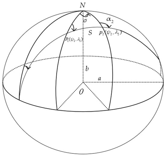 - Calculation of geodesic distance: Using the iterative results, the auxiliary sphere solution is corrected to the ellipsoid by applying ellipsoidal correction terms. First, the coefficients and for the geodesic length are calculated as follows:where