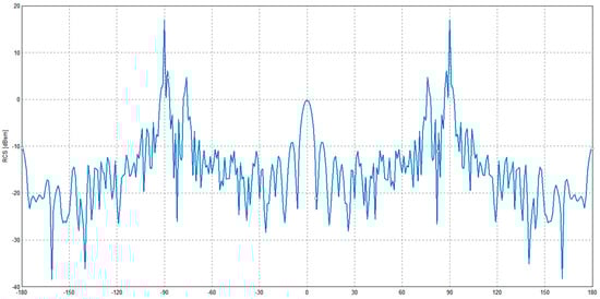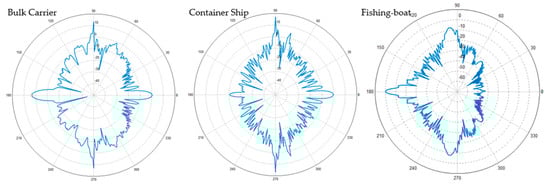 - The Impact of Different Dimensions and Hull Shapes on the RCS: In terms of dimensions, the RCS of fishing vessels is significantly smaller compared to bulk carriers and container ships due to the much smaller hull size. Consequently, their RCS values exhibit considerable differences, with the RCS of bulk carriers and container ships typically ranging from −40 dB to −20 dB, while the RCS of fishing vessels falls within the range of −60 dB to 0 dB. Regarding hull shape, the RCS of bulk carriers, container ships, and fishing vessels exhibits distinct peak values at different angles. For bulk carriers, the superstructure is mainly concentrated at the bow and stern, with relatively open sides, resulting in RCS peaks at 0° and 180°. In contrast, container ships have a more complex hull shape designed for functional purposes, particularly along the sides, which leads to higher RCS values along the ship’s beam. On the other hand, fishing vessels, with their narrow bow and wider stern and sides, exhibit the lowest RCS at the bow and higher RCS values at the stern and beam.