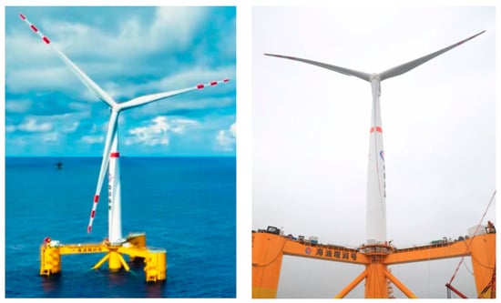 - Zhao, Z.; Li, X.; Wang, W.; Shi, W. Analysis of Dynamic Characteristics of an Ultra-Large Semi-Submersible Floating Wind Turbine. J. Mar. Sci. Eng. 2019, 7, 169. [Google Scholar] [CrossRef]
