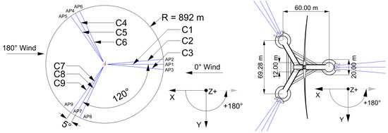 However, the majority of studies about FOWT mooring failures are only concerned with scenarios under which the wind turbine has no mooring redundancy. The lowest number of mooring lines to limit the floating-body motion is set up in these analyses, and the test models are excessively idealized. In the early stage of floating wind power development, some wind turbines were configured with a non-redundant mooring system. For example, WindFloat Atlantic initially adopted a mooring design of 3 × 1 chain–rope–chain catenary lines, and Hywind, as a spar-FOWT, also used a 3 × 1 mooring layout. However, as mooring safety and reliability have appeared particularly important in recent years, an increasing number of FOWT projects have begun to concentrate on the problem. To improve the mooring redundancy in each azimuth angle around the wind turbine, a group of mooring lines are configured in the same direction instead of just one mooring line. For example, the four semisubmersible FOWTs presently erected around China are all configured with redundant 3 × 3 mooring systems, which means that there are mainly three mooring directions around the wind turbine, and there are also three mooring lines in every directional group, as demonstrated in Figure 1. The redundant mooring lines ensure that there will still be residual mooring lines to hold the wind turbine in place if one or two lines are broken. Thereby, it is almost impossible for the simulated failure conditions discussed in the aforementioned studies to occur on an FOWT currently in use; i.e., the wind turbine will not immediately lose all the mooring forces in one direction if a mooring line is broken. It is more likely that the failure condition will be one in which the mooring lines are broken one after another, progressively, and the breakage criterion will be a transient tensing up and an impact load along the mooring chains. The fact that the progressive procedure will be different from the conditions contemplated in the aforementioned studies will probably lead to different subsequent time responses.
