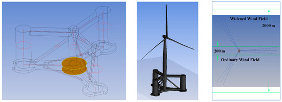 It is difficult to avoid the occasional extreme environments at sea. High-speed wind and high, long waves will lead to enormous loads on the structure. These loads not only damage the slender bodies of the tower and blades but also destroy the mooring system. To reduce wind drag loads on the upper wind turbine, a survival configuration is employed in this study; this is shown in the last image of Figure 2. Firstly, one of the three blades is aligned with the tower. The rotor azimuth will then become 60°. This behavior has two effects: one is to minimize the total windward area of the tower and blades; the other is to reduce the total height of the wind turbine because the two blades above the rotor hub are tilted. Due to friction with the sea surface, the vertical distribution of the wind speed is such that the higher speed is at a higher level. Thus, reducing the total height of the survival configuration can globally decrease the wind loads. Secondly, blade feathering is applied to all the blades to decrease their windward area.