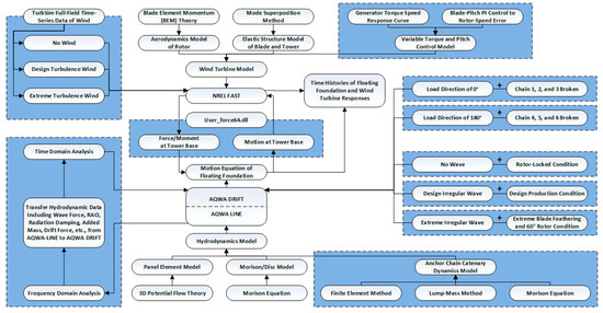 Referring to the target structure, a numerical model of the semisubmersible FOWT with a 3 × 3 anchor chain mooring system is established in terms of 3D potential flow and BEM (blade element momentum) theories. Based on the numerical model, aero-hydro-floating-body mooring coupled analyses can be performed under different environment conditions and mooring failure conditions. When the motion and structural dynamic responses of the FOWT are predicted, the whole wind turbine model can be separated into two basic parts: (1) a hydrodynamics model of the lower floating foundation and the mooring system and (2) an upper wind turbine model, including the tower and blades. The hydrodynamics model is generated in AQWA 19.4, which is a prevalent tool for hydrodynamic analyses. The wind turbine model is recorded in NREL FAST, a well-known simulation software used to analyze fatigue, aerodynamics, structures, and turbulence problems in wind turbines. Both programs have independent time-integral processes in time-domain analysis. However, in this study, they are connected by FAST2AQWA, which is an in-house-developed routine interface designed to communicate data between FAST v7 and AQWA 19.4 [25,26] so that the two models can move together and transfer interaction forces around the tower base. An overview of the wind turbine model is illustrated in Figure 6. An overall sketch diagram for the analysis procedure is demonstrated in Figure 7.