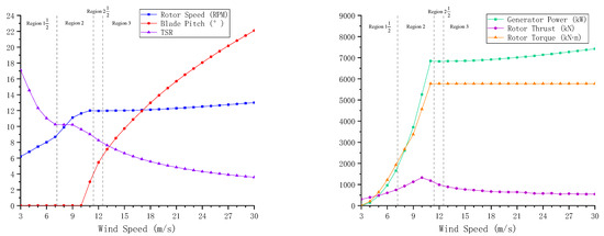 The crucial problem is how much the resisting moment should be generated in different wind conditions by the generator and its control system. The resisting moment is also known as the generator torque. Under a certain generator speed, if the torque is too small, the generator power will be small, but the generator speed will increase next, and vice versa. To utilize the wind energy efficiently under a lower wind speed than the rated wind speed, a generator torque–speed response curve is designed. On the other hand, if the wind speed is higher than the rated wind speed, though the wind energy is currently adequate to realize full-power generation, the high wind speed will probably damage the structures or devices of the wind turbine. A blade pitch control system can reduce the attack angle of blades or fully feather the blades to prevent the above dangerous condition. By comparing the real-time rotor speed with the rated rotor speed constantly and treating the rotor speed error as control input, a blade pitch PI (proportional–integral) control is performed to stabilize the rotor and not overspeed too much in case of rotor racing. Steady-state response curves to different wind speeds are plotted in Figure 9 by using the wind turbine model in this study, including a rotor speed curve, a blade pitch curve, a rotor torque curve, a rotor thrust curve, a generator power curve, and a tip-speed ratio (TSR) curve. The above-mentioned generator torque–speed response curve is also shown in the figure. Moreover, the differential equation of the blade pitch PI control is described as follows [30,31]: