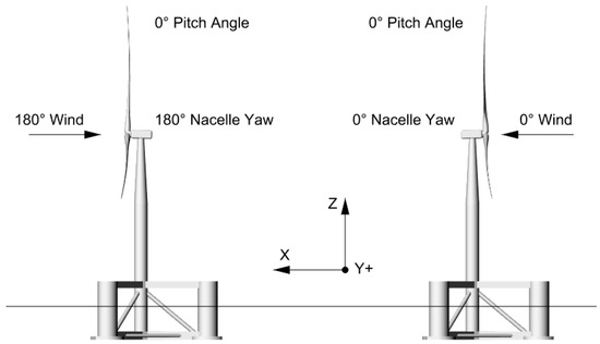 For describing environmental loads and solving the motion of wind turbines, fixed reference axes (FRAs) are initially placed at the center of mass (CM) of the FOWT, which is shown in Figure 3, Figure 4 and Figure 5. The translations or directions along these axes can be expressed as X, Y, and Z. This is a right-handed reference system, and all the positive directions of rotations around these axes, i.e., RX, RY, and RZ, comply with right-handed rules. The positive X-direction is also defined as the direction of 0° wind and wave propagation. Accordingly, the 0° nacelle yaw refers to the current azimuth angle of the rotor shown in the figure.