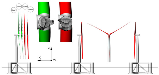 The load cases, with combinations of different condition types, are listed in Table 3. To demonstrate the different wind turbine configurations, the front, lateral, and top views of the wind turbine are provided in detail in Figure 10, Figure 11 and Figure 12. State 1 to state 4 in Figure 11 correspond to the respective four states in Figure 12. The green blades in these figures are at a 0° pitch angle in the design production condition, and the red blades are at a 90° pitch angle (known as feathering) in the extreme survival condition.
