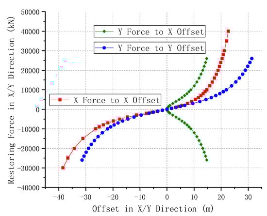 The total static stiffness in six DOFs (degrees of freedom), provided collectively by the nine anchor chains, was acquired by performing a static stability test. The static stability is not connected with the gravity and buoyancy of the floating foundation and, in fact, is a property of the anchor chain mooring system. The restoring force–offset curves are plotted in Figure 13.