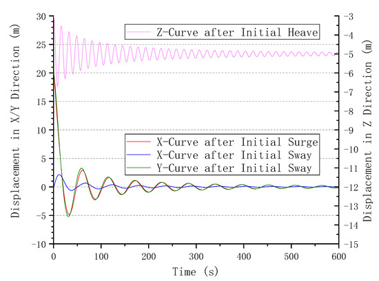 Free decay curves of the FOWT motion in the X, Y, and Z directions.