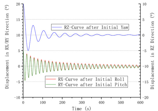Free decay curves of the FOWT motion in the RX, RY, and RZ directions.