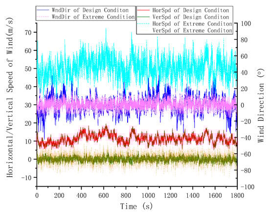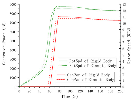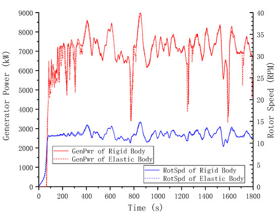 To prove the validity of the wind turbine model independently, the tower was fixed on the floating foundation, whose six DOFs were all locked at their initial position, as in a fixed wind turbine. The whole starting and working procedure of the model was simulated in a rated-speed steady wind and rated-speed wind turbulence. Under the steady wind condition, the test results obtained in a shear wind were very close to those obtained in a uniform wind. Thus, here, the slight difference was neglected. Furthermore, the difference between the blades and tower as rigid bodies or as elastic beams was estimated. The responses of rigid bodies are represented in solid curves, while the responses of elastic bodies are plotted in dashed curves. The generator power and rotor speed curves during the starting procedure in the steady wind are shown in Figure 16. In the meantime, the variable torque and pitch control took effect. These same curves under design wind turbulence conditions are illustrated in Figure 17. Based on the TurbSim wind models, the speed and direction fluctuations in the design and extreme wind turbulence are exhibited in Figure 18. Identical wind files will be applied to the next simulations of mooring failure problems. The time histories of the wind force and the moment extracted from the tower base are described in Figure 19 and Figure 20. Under extreme wind conditions, the rotor was locked, and the blades were feathered at a 90° pitch angle. From these above response curves, it is clear that an initial 300 s duration was adequate for the wind turbine to avoid the initial condition effects.