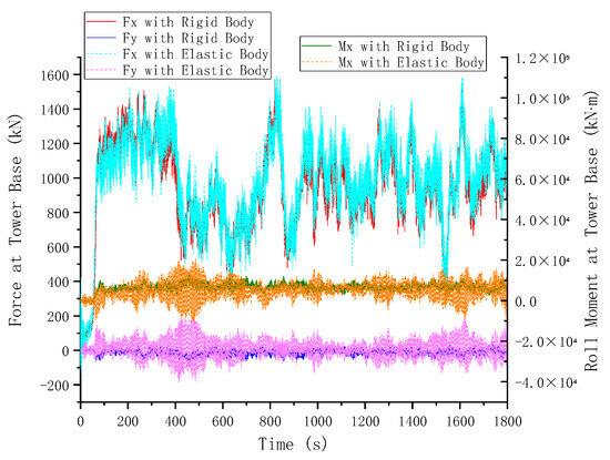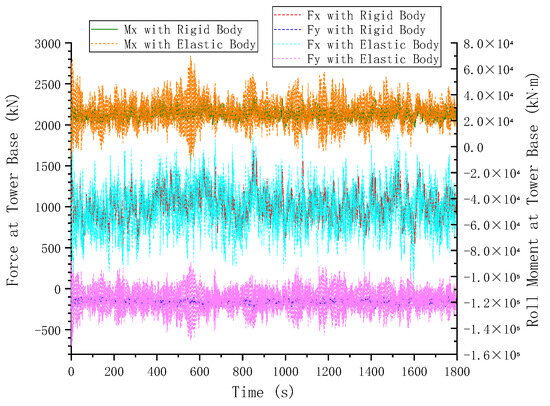 Force and roll moment fluctuations at tower base under design wind turbulence.