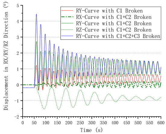 According to the curves above, the surge peak of C4 is −2.65 m, and the sway peak of C4 reaches 4.62 m. The corresponding surge offset is −1.58 m, and the sway offset is 2.74 m. The transient-state increase in the surge is 68%, and the increase in the sway is 69%. Under C4 + C5, the surge peak is −7.04 m, and the sway peak reaches 9.77 m. The surge offset is −4.85 m, and the sway offset is 6.86 m. The transient-state increase in the surge is 45%, and the increase in the sway is 42%. Under C4 + C5 + C6, the surge offset is more than −84 m, and the sway offset is more than 147 m. Similarly, there is almost no transient-state effect in the responses. As for the platform rotation, the yaw peak of C4 + C5 reaches −1.56°, and the corresponding yaw offset is 0.86°. Briefly, the new planar equilibrium positions of the three failure cases are (1.58 m, 2.74 m), (−4.58 m, 6.86 m), and (−84 m, 147 m). The transient- and steady-state values of yaw motion are much larger than those of C4 or C4 + C5 + C6 because C5 is the chain at one side of the group and the failure cases of C4 and C4 + C5 + C6 occur with a symmetric residual layout of the mooring system in the mooring azimuth angle of C4. Thus, in every three-chain group of an FOWT, if an outside chain is accidentally broken, it will lead to an excitation of yaw. However, this will not occur when the inside chain is broken. For an FOWT in which every mooring chain group has only two chains, the breakage of any one chain will cause excitation of the yaw. Although, in these cases, the amplitude of the yaw motion would not be very large, it would perhaps be adequate to constitute an initial disturbance or induction factor, causing the platform to keep rotating subsequently under the influence of environmental loads. Eventually, under the tension of the residual chain groups, the platform drifts away in another direction, and the residual chains become slack. As a result of the fairlead towage and seabed friction, the laid length of the chain on the seabed is curved rather than straight, and the intersection and collision of different chains within a chain group appear.