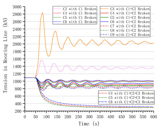 - According to the motion and tension response curves that were obtained, the more chains that are broken, the further the position offset of the platform will be. The offset direction from the initial equilibrium position is on the opposite side of the broken chain. When the chains are broken, the tensions in the residual chains within the same group increase, and the maximum tension may threaten to approach the breaking load, inevitably causing more chain breakages. Meanwhile, the tensions in the other two residual groups decrease. When the platform moves and approaches the motion limit of the residual chains, the tensions in some of them will rise again. As a result of blade feathering, the tensions in chains under extreme conditions do not increase very much from the tension level under design conditions.