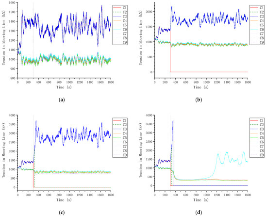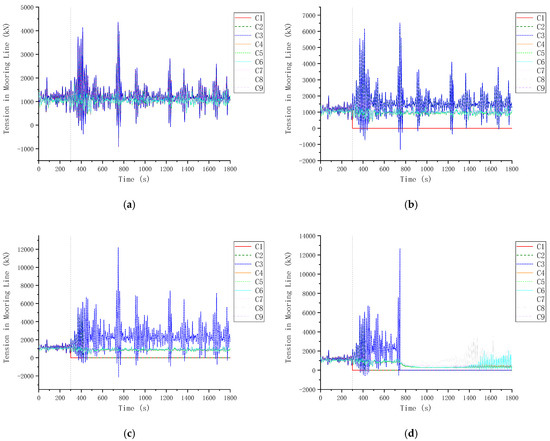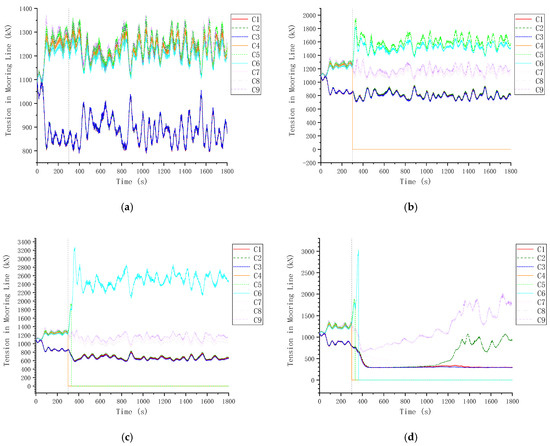 Anchor chain tensions under C123 mooring failures in 0° extreme wind and wave. (a) HM; (b) C1; (c) C1 → C2; (d) C1 → C2 → C3.
