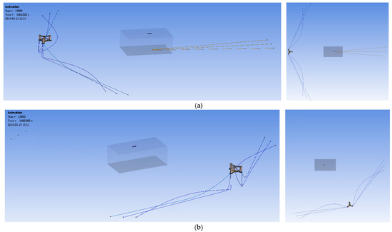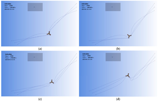 Table 6 shows a summary and predictions of the planar trajectories denoted by the CM of the FOWT under a scenario of 0° extreme wind turbulence and irregular wave and setting C123 to be broken. The trajectories in the first 300 s duration are neglected. The time histories of the anchor chain tensions are shown in Figure 28. From the top to bottom and left to right, they are, respectively, under healthy mooring (HM), under failure of C1 only (C1), under failures of C1 to C2 (C1 → C2), and under failures of C1 to C2 and then to C3 (C1 → C2 → C3). Similarly to the failures in design conditions, C1 was broken at 300 s, C2 was broken at 413.9 s, and C3 was broken at 747.1 s. The final situation after the chain group was fully broken is displayed in Figure 29. For ease of viewing, the images have been rotated, and the wind and wave appear to come from the bottom of the image. Under the extreme environment, a longer simulated duration is required for the FOWT to drift adequately to the motion limit provided by the two residual groups of chains. Thus, from the 900th second to the 3000th second, the snapshots are captured with an interval of 300 s. To cover the full scope of the FOWT’s large rotor motion, a wide wind field is subsequently generated under the condition in which a whole chain group is broken.