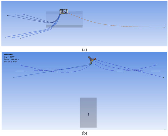 - The final patterns of the two residual chain groups are simulated and demonstrated, and the phenomena of slack chains, curved laid lengths, and chain intersections are captured at the end. Under the design conditions and extreme conditions, when a whole chain group is completely broken, a deflection angle of 60° can appear on the laid length of the chain in the two residual groups, which is enough to bring about dangerous dragging of the anchor if the applied anchor is not designed to hold the omnidirectional mooring load. In fact, to reduce the cost of the distributed catenary mooring system, the majority of anchors used in ocean engineering are not designed to hold this load. Moreover, the situation for the entire mooring system worsens as an increasing number of residual chains lose their holding power in the seabed.