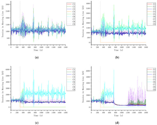 Anchor chain tensions under C123 mooring failures in 0° design wind and wave. (a) HM; (b) C1; (c) C1 → C2; (d) C1 → C2 → C3.