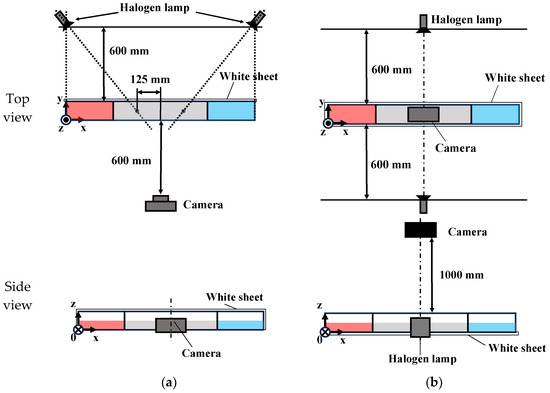 Halogen lamps were used as light sources, and the experiments were recorded using a video camera. The tank was filmed from the top and side, and the arrangement of the optical system and camera during the experiments is shown in Figure 2. The camera had a frame rate of 30 fps and a resolution of 2160 × 3840 pixels. To analyze the behavior of density currents using image brightness values, a white background was necessary; therefore, white paper was placed on the opposite side of the tank from the camera.