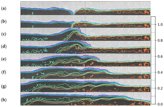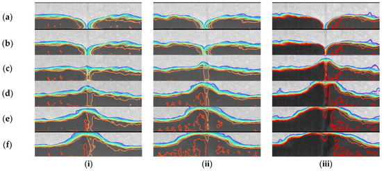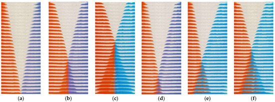 Images were extracted from the video taken and cropped to the size necessary for analysis. In each experimental condition, the images (x: 200–800 mm × z: 0–50 mm) were taken from the side of the camera at a time interval of 0.33 s from 1.66 to 10.66 s. The images in each experimental condition are shown in Figure 3. Experimental conditions from left to right are (a) 1%:1%, (b) 2%:2%, (c) 4%:4%, (d) 1%:2%, (e) 1%:4%, and (f) 2%:4%.