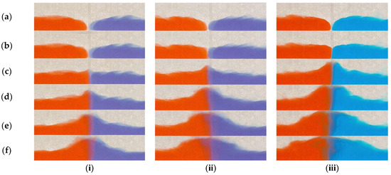 Side view of 2 density currents: (i) 1%:1%, (ii) 2%:2%, and (iii) 4%:4%, (a) t = 0 s, (b) t = 0.13 s, (c) t = 0.53 s, (d) t = 0.93 s, (e) t = 1.33 s, and (f) t = 1.73 s (red: same dense fluid, blue: same dense fluid).