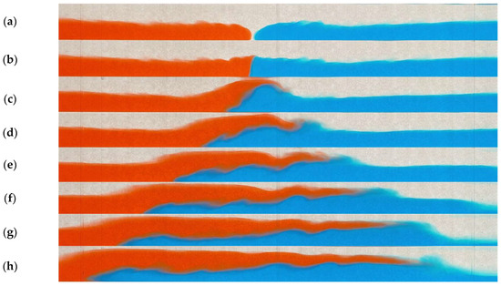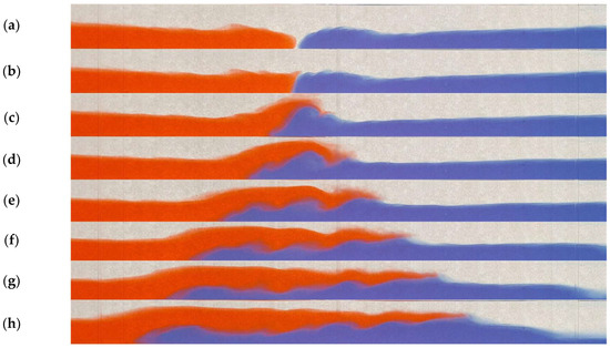 Side view of 2 density currents (1%:4%): (a) t = 0 s, (b) t = 0.33 s, (c) t = 1.33 s, (d) t = 2.33 s, (e) t = 3.33 s, (f) t = 4.33 s, (g) t = 5.33 s, and (h) t = 6.33 s (red: less dense fluid, blue: denser fluid).