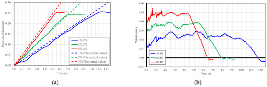 Figure 7 shows the relationship between head position and time (a) and between head velocity and time (b) for density currents of the same density. Figure 8 shows the relationship between head position and time (a) and between head velocity and time (b) for density currents of different densities. In the present experiment, the conditions under which the head of the density current is not affected by the reflected waves on the end wall of the tank are discussed. The measurement range was set up to the position where the effect of reflected waves does not appear. It is known that the density current is divided into three developmental stages: an initial stage in which the density flow proceeds at a constant speed, a self-similar stage in which the density flow proceeds in proportion to the second power of time, and a viscous stage in which the density flow proceeds in proportion to the fifth power of time, and that the velocity at the head of the density current changes significantly depending on the developmental stage [21]. Coefficient μ, the head position of the viscous phase, can be expressed by Equation (26) [18].