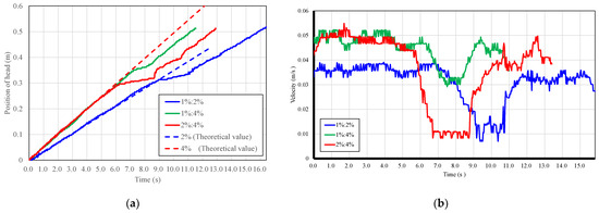 Since the velocity at 0.0–5.0 s in Figure 7b and Figure 8b is almost constant and the head position is proportional to time, it can be inferred that the developmental stage remains in the initial stage in this experiment.