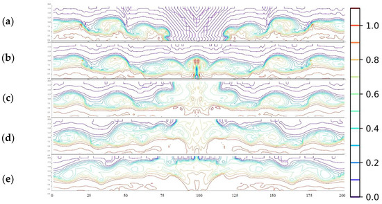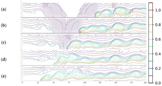 Side view of density field in the simulation (1%:2%): (a) t/T = 10, (b) t/T= 13, (c) t/T = 16, (d) t/T = 19, and (e) t/T = 21.