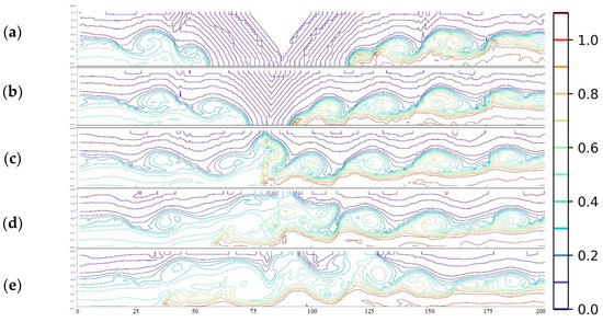 In collisions involving different densities, the density interfaces between the density currents in Figure 10 and Figure 11 are compared. Figure 10 shows the wider spacing of the iso-density lines, demonstrating that smaller density differences result in greater density diffusion. Large density differences stabilize stratification and suppress mixing. Vortex generation can be observed behind the leading edge in Figure 11. The wide spacing of the iso-density lines at the vortex generation sites indicates that vortex formation influences density diffusion. Additionally, as seen in Figure 5 and Figure 6, the larger the density difference, the quicker the vortices disappear, and the interface stabilizes. Vortices caused by Kelvin–Helmholtz instability are generated due to velocity differences, which are also dependent on the density differences between the fluids. Hence, stronger density diffusion does not necessarily occur with smaller density differences.
