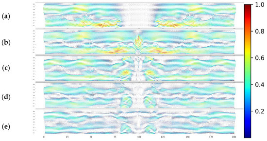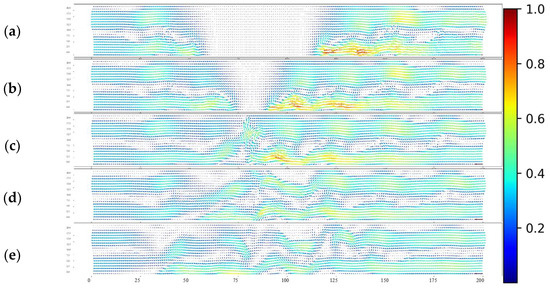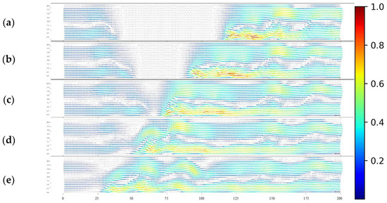 Figure 15, Figure 16 and Figure 17 show the contour plots of velocity fields for numerical calculations with 1%:1%, 1%:2%, and 1%:4% concentration ratios, respectively. The time interval for each image is dimensionless time (t/T) 3. Observing the pre-collision velocity fields in Figure 15, Figure 16 and Figure 17a, density currents move toward the center at the bottom of the tank, while vortices form between the water and density currents above, and the water moves in the opposite direction to the density currents at higher levels, as indicated by the velocity vectors. For collisions of density currents with the same density, as shown in Figure 15b,c, similar to the experimental results, the density currents rise after the collision, generating internal bore that spread and break laterally. Furthermore, as shown in Figure 15c,e, vortices are formed below the collision area for a while after the collision. These vortex formations promote diffusion at the collision site. For collisions of density currents with different densities, as seen in the experiments, the velocity fields in Figure 16c,d, and Figure 17c,d also show that the lighter density current moves vertically upward immediately after the collision, while the denser density current moves under the less dense one.
