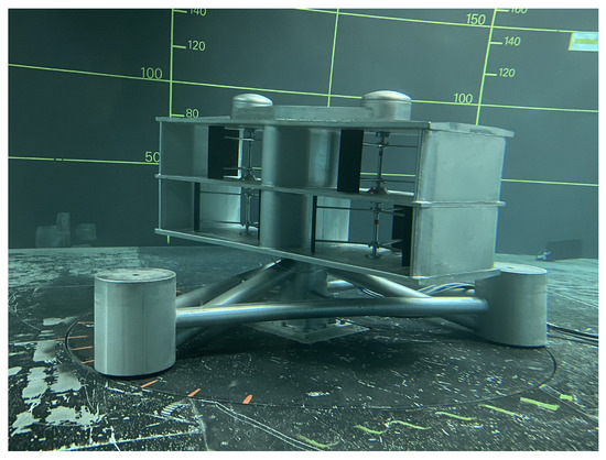 For this study, Froude similarity () is considered to reproduce hydrodynamic conditions in the tank similar to the ones found at sea. The Froude number is around 0.24 at reduced scale and 0.17 at the Paimpol-Bréhat site, with a structure height of 17 m, a water depth of 40 m and a maximal current speed of about 2.5 m/s at full-scale. Based on the chord length, the Reynolds number, with = 1.05 × 10−6 m2/s the kinematic viscosity of the water, is about 5.2 × 106 in situ and 8 × 104 in the tank, which is approximately 60 times lower than at full scale. Due to the non-respect of Reynolds number similarity, the performance of 2-VATT is underestimated [24], whereas wake development is not affected.