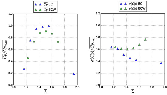 A comparison is made at 0.8 m/s for the mean and standard deviation of between EC and ECW. Therefore, the mean curve is plotted depending on the mean tip speed ratio (Figure 5). Overall, the global performance of the 2-VATT shows that the mean value is barely affected by the presence of surface waves, although a minor difference less than 8% is visible at . However, the power fluctuations are significantly increased as increases with a difference in the standard deviation of around 32% at the optimal operating point (i.e., where the is maximal). Ref. [25] showed that the increase in power fluctuations is related to an interaction between rotor rotation and surface waves.