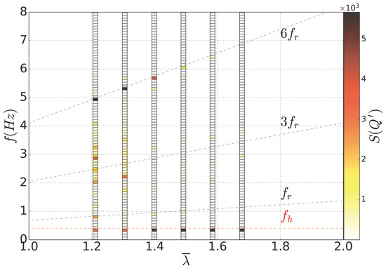 To better understand the periodic variations in the torque of the 2-VATT induced by the waves, Figure 6 provides the Campbell diagram of the torque of the 2-VATT. It is noteworthy that at a transition occurs between the density contained at 6 times the rotation frequency () and the high density imposed by the surface waves at . In fact, below , the signal component at 6 seems to predominate over the rest, whereas, for , the signal component at largely dominates the spectral content of the torque. Therefore, when the tip speed ratio is high, the torque power distribution is fully driven by the wave-induced orbital velocity.