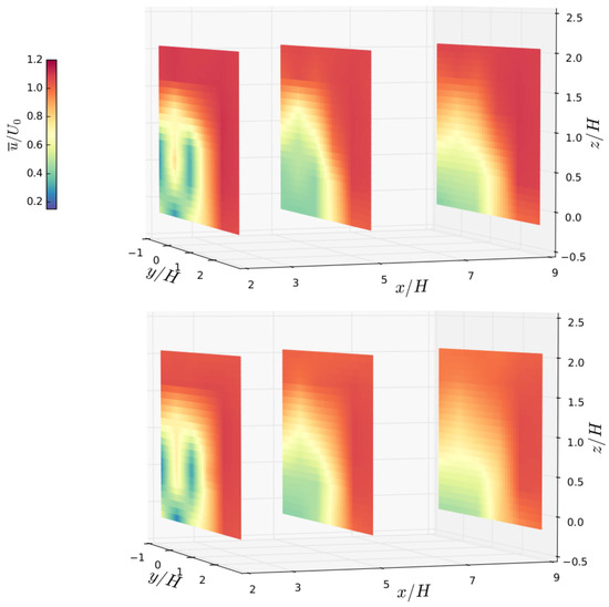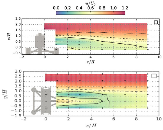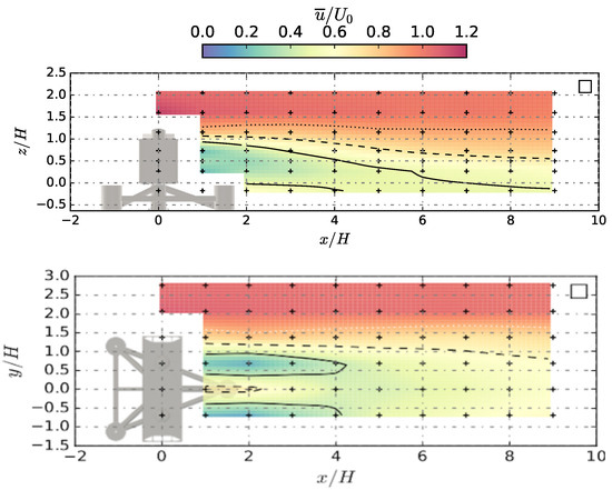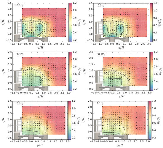 At x/H = [0; 1], measurement planes are reduced because of the space required by the machine. The velocity maps presented below are based on linear interpolation between each measurement point. The interpolation step is 50 mm in the main direction (x) and 40 mm in the two other ones (y, z).