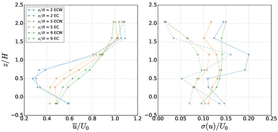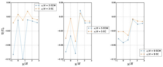 This can also be seen on the horizontal profiles of the mean vertical velocities (Figure 17), where the transverse velocity w is more important in ECW than in EC. Therefore, the waves tend to flatten the wake against the bottom of the flume tank, explaining that the maximum velocity deficit is less pronounced in ECW.