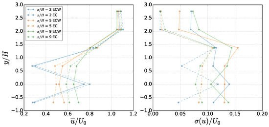 As it is commonly mentioned, the threshold of = 0.9 is used to characterize the point at which the wake reaches its boundary [10]. Therefore, it is easy to study the average development of the wake height and width from this threshold. To do so, and in agreement with the studies of [11], Figure 12 displays the average wake height over the half turbine width by varying the downstream position in the EC and ECW. The average wake height is highly sensitive to wave action. In fact, the waves interfere with the wake, causing an increase in the turbine wake height. For all downstream positions, the wave effects are visibly reflected by an increase of around of the average wake height at . The same observations were made in the case of regular waves following the current, where the wake height is greater in FCW than in FC. In the same way, Figure 12 illustrates the evolution of the average wake width over the turbine height of the wake boundaries of the 2-VATT for different x-positions. Similar to what we saw for the height, the width of the wake is modified by the presence of the waves. Indeed, we see an increase in wake width from = 2 to = 9. However, the impact of the wave is more pronounced in the far wake of the 2-VATT with a wake width being wider at = 2 and of around wider at = 9 in comparison to EC. The results obtained in the flood tide configuration show that the FCW cases have an average wake width that is wider at = 2 and around wider at = 9 than the FC cases.
