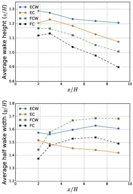 Comparison of the evolution of the wake height (top) and width (bottom) as a function of the x-position for all the test cases.