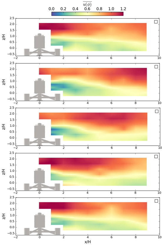 Figure 13 presents the phase average of the streamwise velocity, for five phase instants, from to . At = , the wave trough passes over the head of the tidal turbine and = 0 corresponds to the wave crest. As it can be observed, the wave propagation is underlined by an alternation of low and high streamwise velocity components close to the free surface induced by the transition between the crest and the trough of the wave. In fact, in these zones the orbital velocity is sometimes in the direction of the current (trough) and other times against the current (crest).