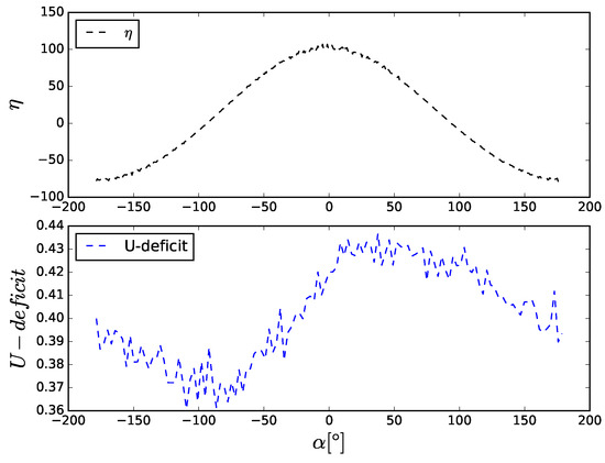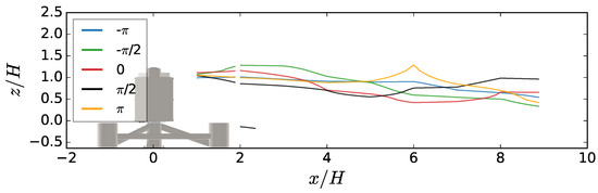 To sum up, the maximum velocity deficit is defined as all velocity . Thus, Figure 15 displays the evolution of the maximum velocity deficit as a function of the wave phase. We noted that the evolution of the maximum velocity deficit is out of phase with . Indeed, the lowest velocities are encountered when the transition between trough and crest occurs whereas the highest velocity is observed after the passage of the wave crest. The difference between the local min and max velocity deficit is about 18%. Thus, phase averaging reveals a significant change in wake shape, which can lead to significant velocity fluctuations and alter wake dynamics.