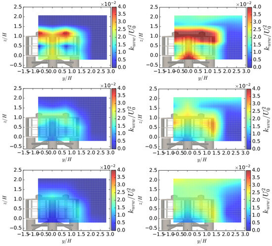 Maps of the normalized Fluctuating Kinetic Energy (TKE) in (y, z) plane, respectively, from top to bottom at = 2, 5 and 9 in EC (left) and under wave conditions (right).