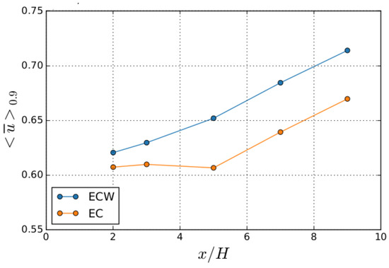 Spatial average of the mean streamwise velocity over the wake region delimited by 0.9 in EC and ECW.