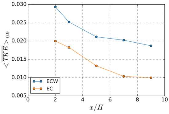 Spatial average of the turbulent kinetic energy over the wake region delimited by 0.9 in the EC and ECW.