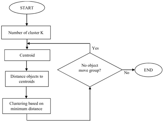Figure 5 includes the flow chart of K-means clustering. The process begins by specifying the number of clusters K and initial centroid. After calculating the distance of each object to the centroids, objects are assigned to the centroid that is closest. Then, the algorithm checks whether any objects have moved between groups. If no objects have changed groups, the process ends. Otherwise, the algorithm continues clustering based on the minimum distance, repeating the steps until convergence.